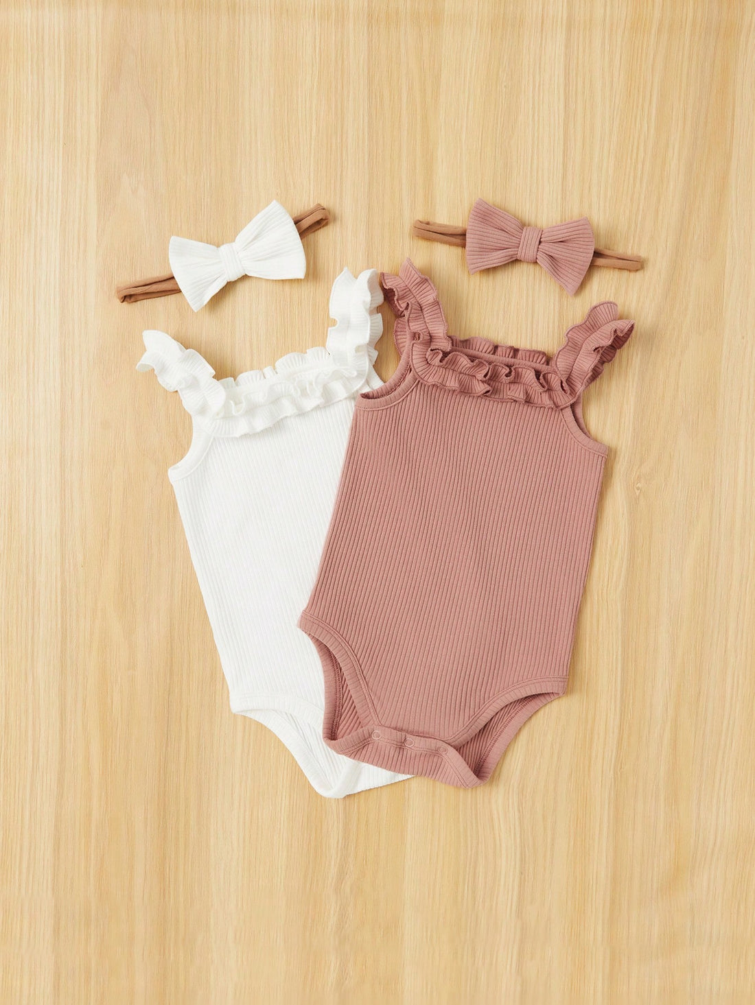 2pcs Baby Girl Casual Cute Knitted Solid Color Ruffle Strap With Headband Set