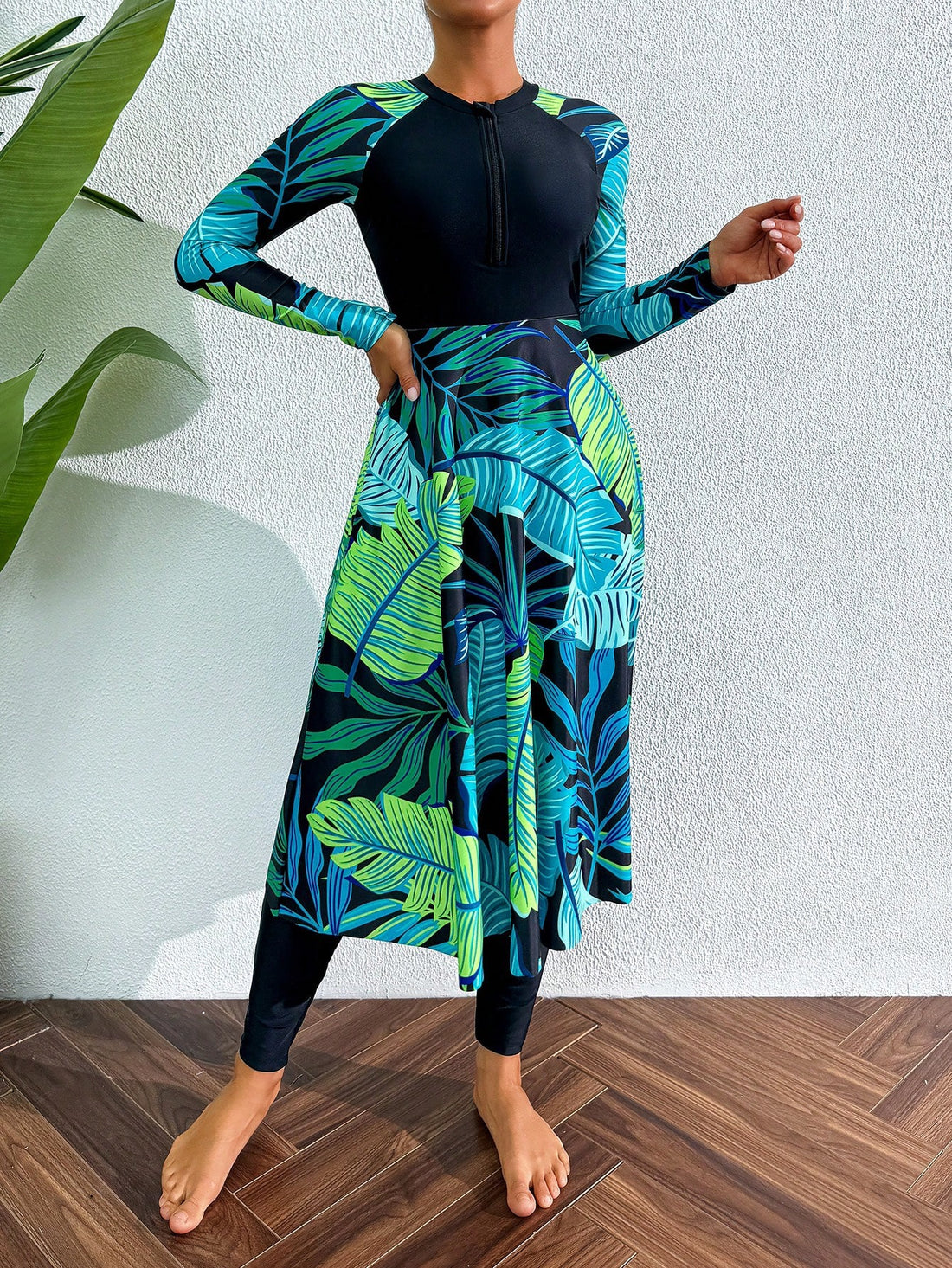 Plus size zip front turquoise swim dress and leggings