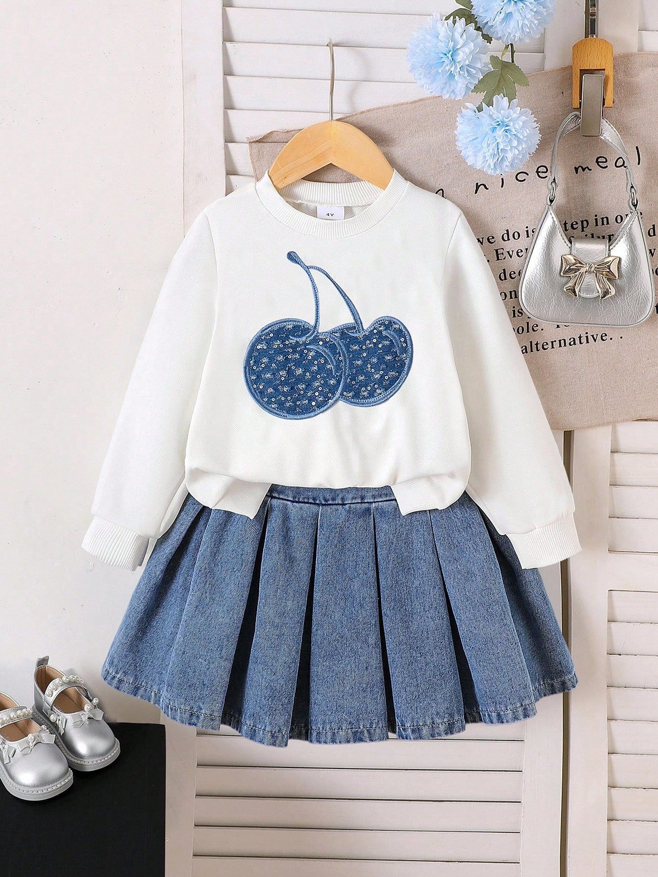 Cherry Sweater with Denim Skirt Set