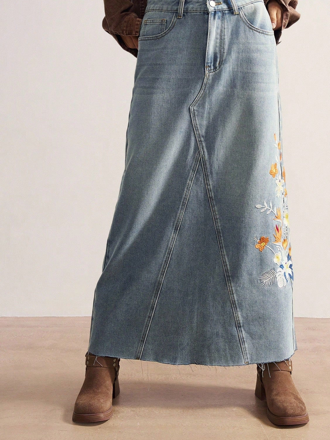 Denim skirt with floral embroidery