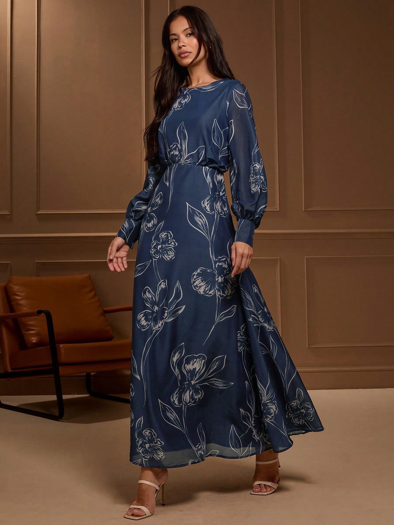 Lantern Sleeve Navy Floral Waisted Dress