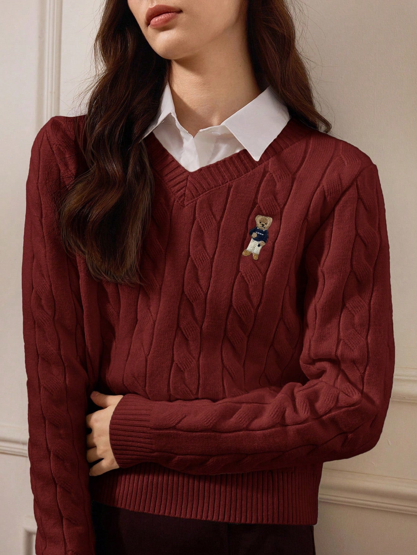 Maroon V neck Sweater with Bear Details