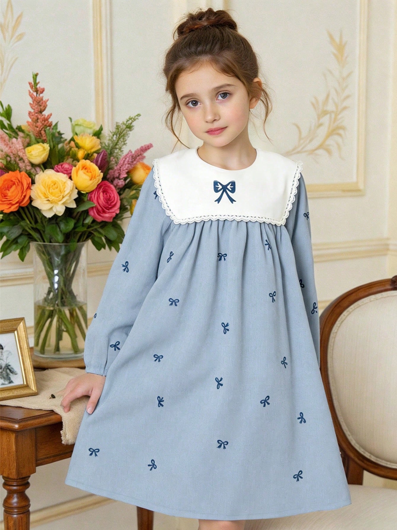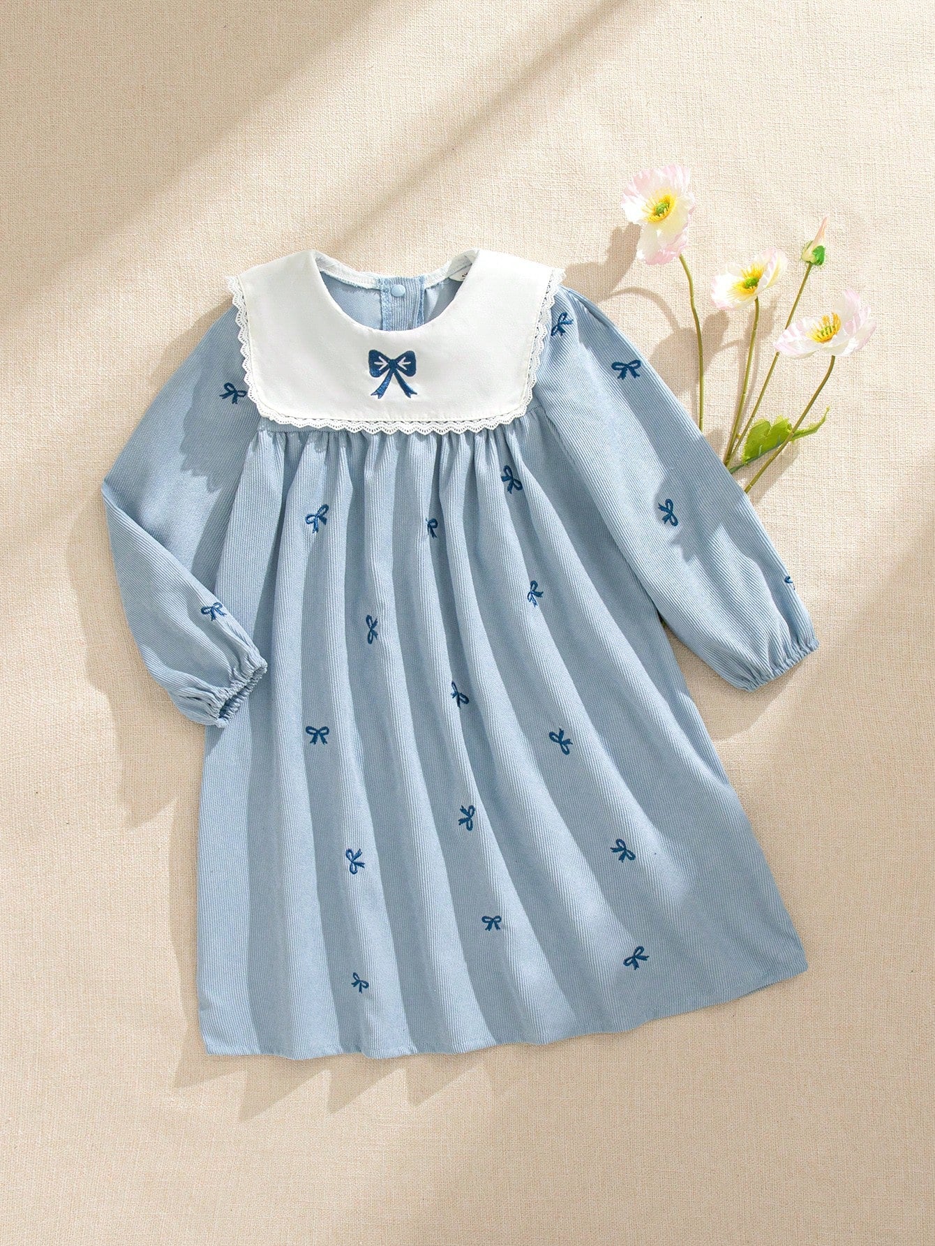 Navy Collar Bow Embroidered Collar Ruffle Dress