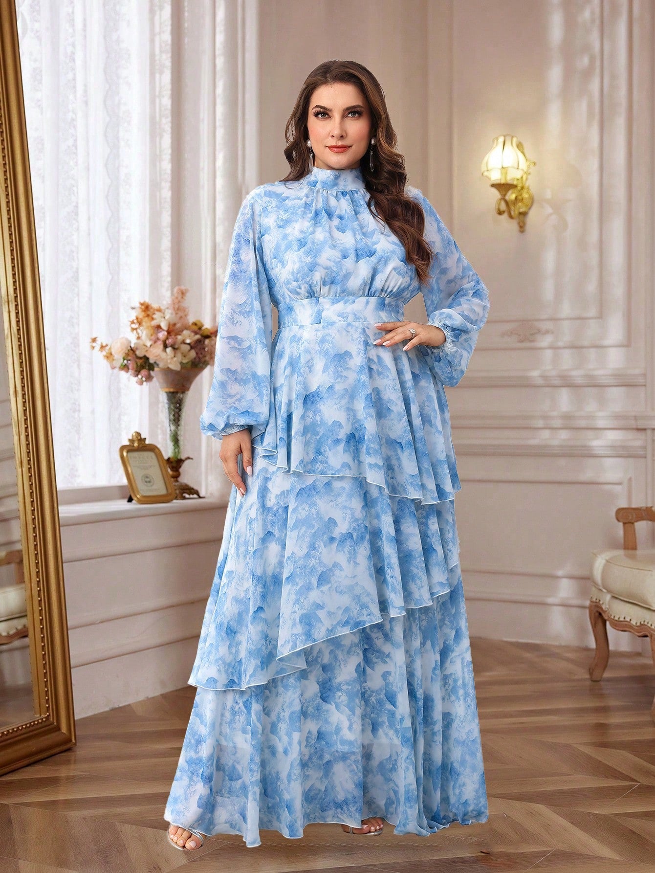 Plus light blue tie dye ruffle maxi dress