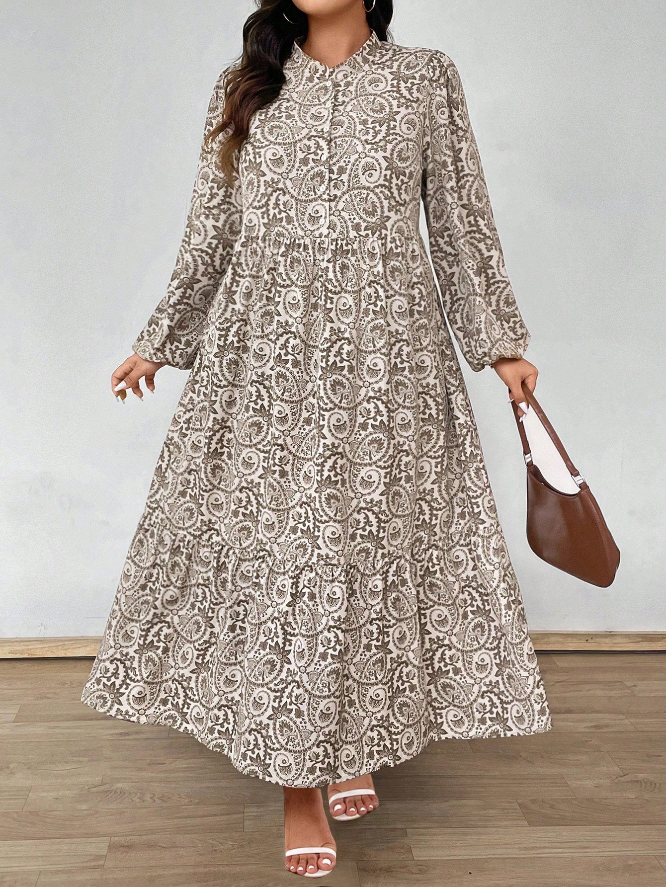 Plus Size Allover Print Lantern Sleeve Ruffle Hem Dress