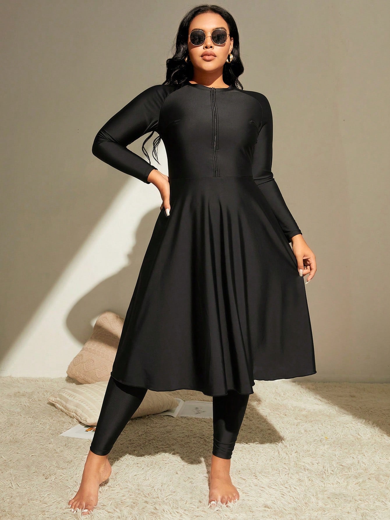 Plus size zip front Black swim dress and leggings